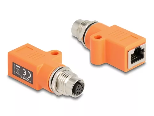 Delock M12 A-kódolt adapter 8 tűs anya - RJ45 anya Cat.5e beszerelő mélyedéssel, egyenes, narancssárga színű (DL-60618)