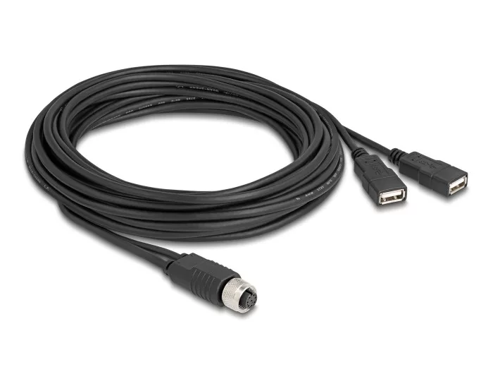 Delock M12 kábel A-kódú, 8 tűs anya- 2 x USB 2.0 A-típusú anya 5 m fekete (DL-60652)