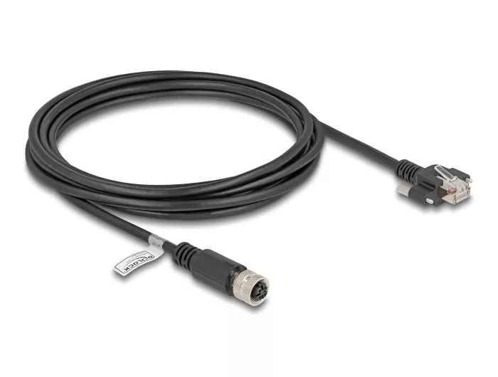 Delock M12 kábel D-kódú 4 tűs anya - RJ45 apa csavarokkal Cat.5e FTP 3 m hosszú fekete (DL-80450)