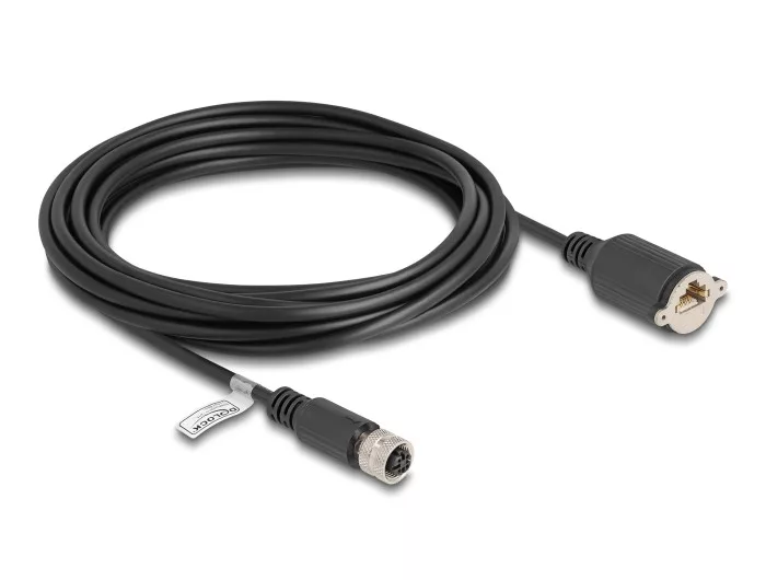 Delock M12 kábel D-kódú 4 tűs anya - RJ45 anya Cat.5e FTP installálásához 5 m, fekete (DL-80455)