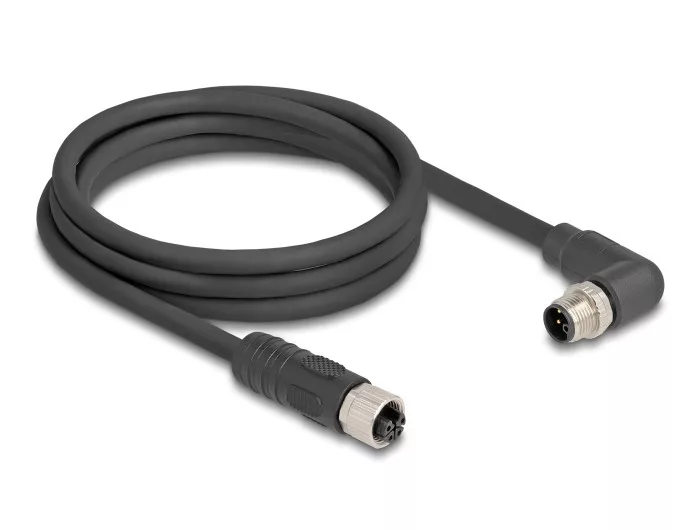 Delock M12 kábel L-kódolt 4 tűs jobbra hajlított apa   egyenes anya PUR húzóláncokhoz alkalmas 2 m fekete (DL-80529)