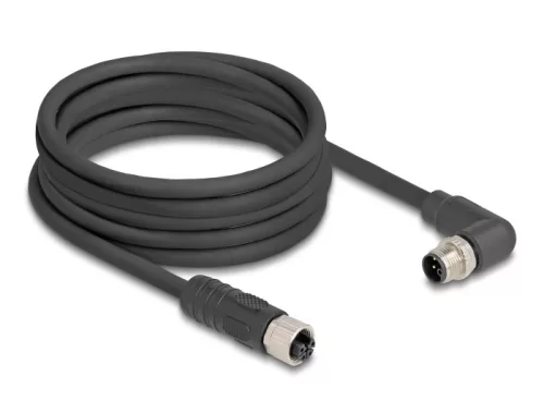 Delock M12 kábel L-kódolt 4 tűs jobbra hajlított apa   egyenes anya PUR húzóláncokhoz alkalmas 5 m fekete (DL-80531)