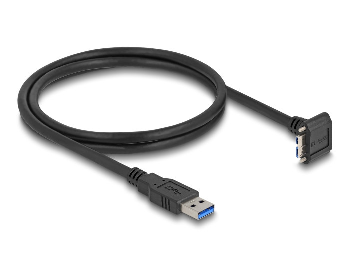 Delock USB 5 Gbps kábel A-típusú USB apa egyenes Mikro-B-típusú USB apa 90 -ban lefelé fordított 18 mm-es csavar távolsággal 1 m, fekete (DL-81030)