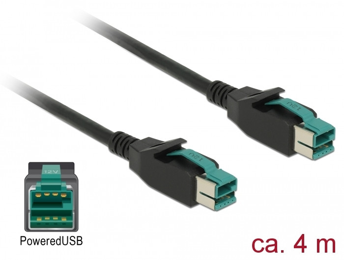 Ezzel a Delock PoweredUSB kábellel összekapcsolható egy PoweredUSB 12 V porttal rendelkező eszköz egy személyi számítógéphez vagy hub-hoz, aminek 12 V-os PoweredUSB portja van. Különböző POS eszközök, például nyomtatók és terminálok csatlakoztatására alkalmas, pl. az Epson, az IBM, a Wincor vagy a IBM termékei. A kábelt mind adatátvitelre, mind a csatlakoztatott eszköz tápellátására használják.