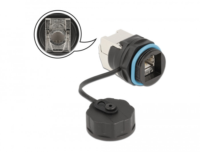 Ez a Delock kábel konnektor használható egy hálózati kábel csatlakoztatására egy RJ45 anya portba. A foglalat menetes gyűrűvel és csavaros védőkupakkal védi az RJ45 anyát a kosztól és portól és ideálos kültéri használatra.
