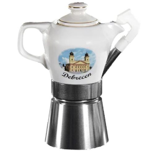 A Fatima 15554 kotyogós kávéfőző 2-4 csésze kávé elkészítésére alkalmas. Hagyományos kávéfőző, biztonsági szeleppel. Fedeles porcelán kiöntővel, színes képpel, felirattal. Fényezett, alsó alumíniumtest. Nem igényel elektromos áramot, gáztűzhelyen, elektromos főzőlapon is kitűnő aromájú eszpresszó kávé készíthető. Speciális tölcsérével 2 és 4 személyes adag is főzhető. Jellemzők: - 2-4 csésze kávé főzésére alkalmas - Minta: Debrecen - Anyaga: alumínium, porcelán