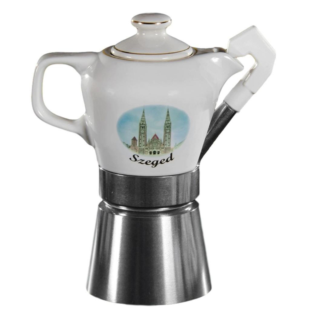 A Fatima 15558 kotyogós kávéfőző 2-4 csésze kávé elkészítésére alkalmas. Hagyományos kávéfőző, biztonsági szeleppel. Fedeles porcelán kiöntővel, színes képpel, felirattal. Fényezett, alsó alumíniumtest. Nem igényel elektromos áramot, gáztűzhelyen, elektromos főzőlapon is kitűnő aromájú eszpresszó kávé készíthető. Speciális tölcsérével 2 és 4 személyes adag is főzhető. Jellemzők: - 2-4 csésze kávé főzésére alkalmas - Minta: Szeged - Anyaga: alumínium, porcelán